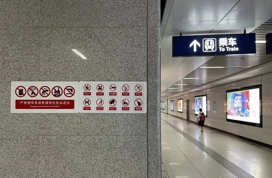 地铁站墙壁上的禁止携带易燃易爆品提示