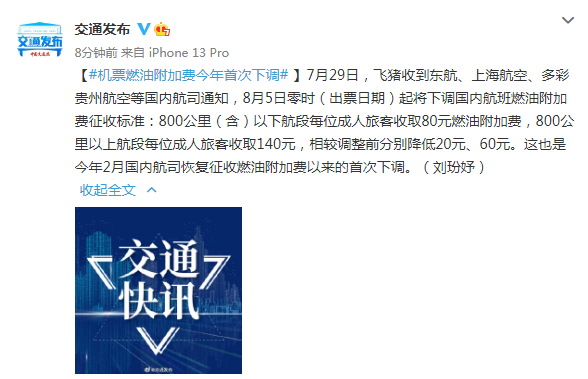7月29日,飞猪收到东航、上海航空、多彩贵州航空等国内航司通知,8月5日0时(出票日期)起将下调国内航班燃油附加费征收标准: