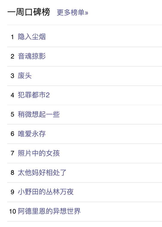 最后,还是附上豆瓣电影的一周口碑榜的榜单: