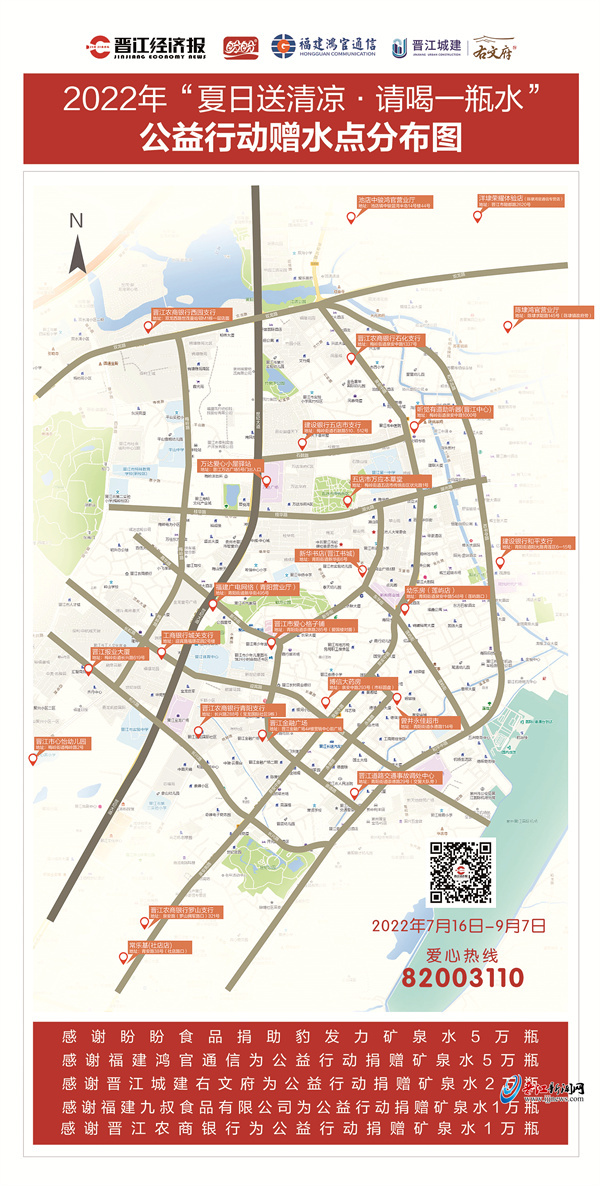 晋江新闻网7月31日讯 为了让更多的高温下劳动者喝到“爱心水”,今日,由第五届“夏日送清凉·请喝一瓶水”公益行动特别策划的“清凉一站”地图正式上线,在本报及官方微信公众号发布。