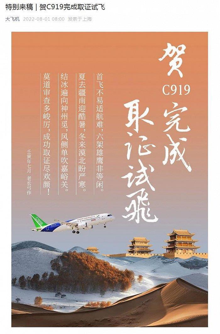 中国商飞官微8月1日宣布,国产大飞机C919完成取证试飞。