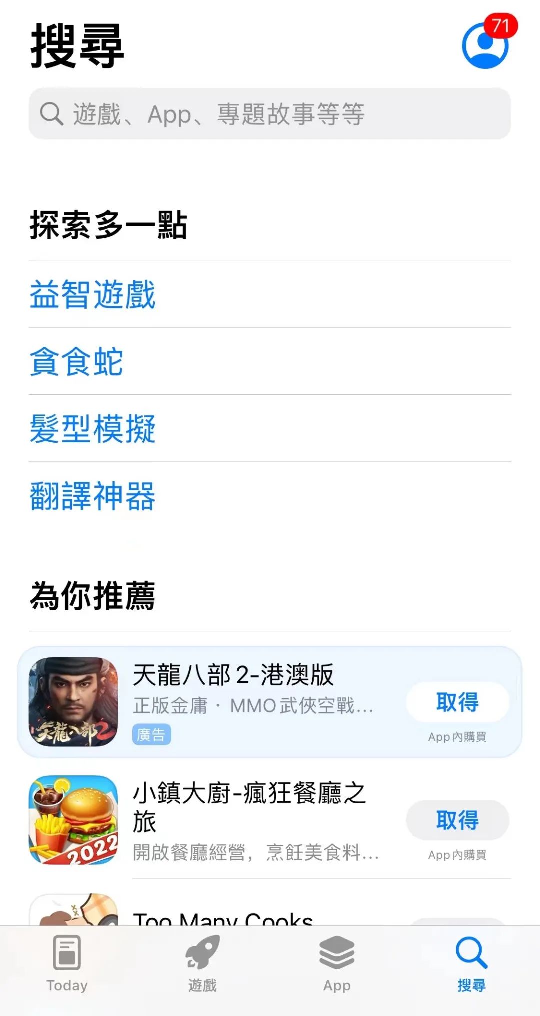 另外,在搜索页面的“为你推荐”,同样也会有蓝色广告标志的 APP 排在前面,获得更多曝光量。