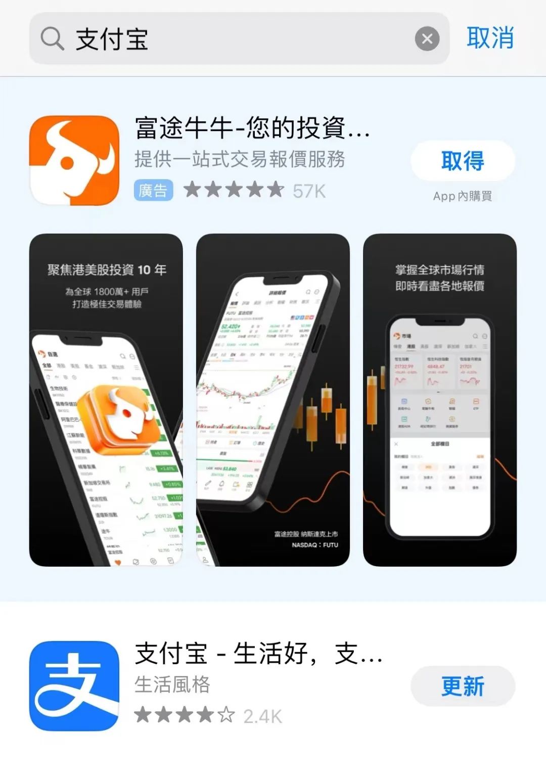 举个例子,例如果子想搜索支付宝的时候,排在第一的竟然是富途牛牛。