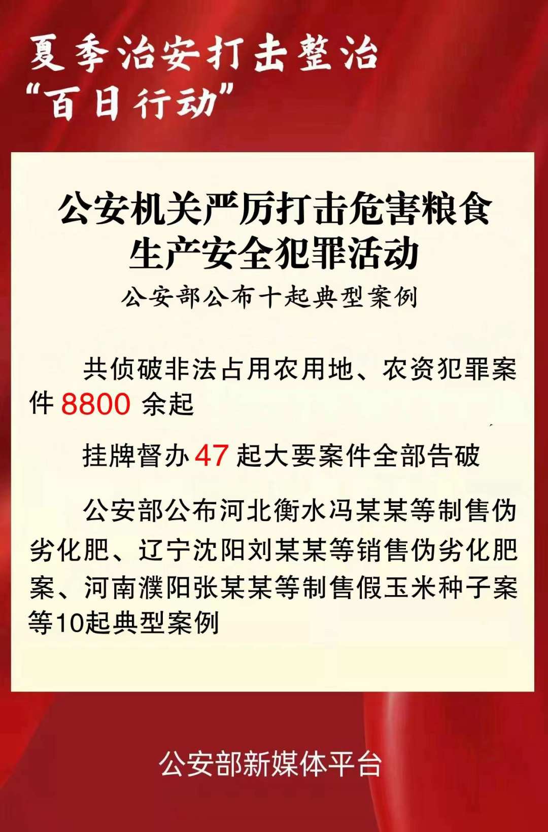 长沙晚报掌上长沙8月1日讯 据人民日报客户端消息 全国公安机关紧密结合夏季治安打击整治“百日行动”,持续深入开展“昆仑”系列专项行动,依法严厉打击制售假劣农资、非法占用耕地等危害粮食生产安全的犯罪活动,全力保障农业生产,切实维护国家粮食安全。去年1月以来,公安机关共侦破非法占用农用地、农资犯罪案件8800余起,公安部挂牌督办47起大要案件全部告破。公安部今天公布公安机关打击危害粮食生产安全犯罪10起典型案例。