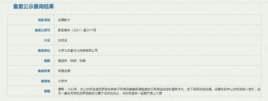 《东极岛》已于去年8月备案,但目前尚未公布具体进度。
