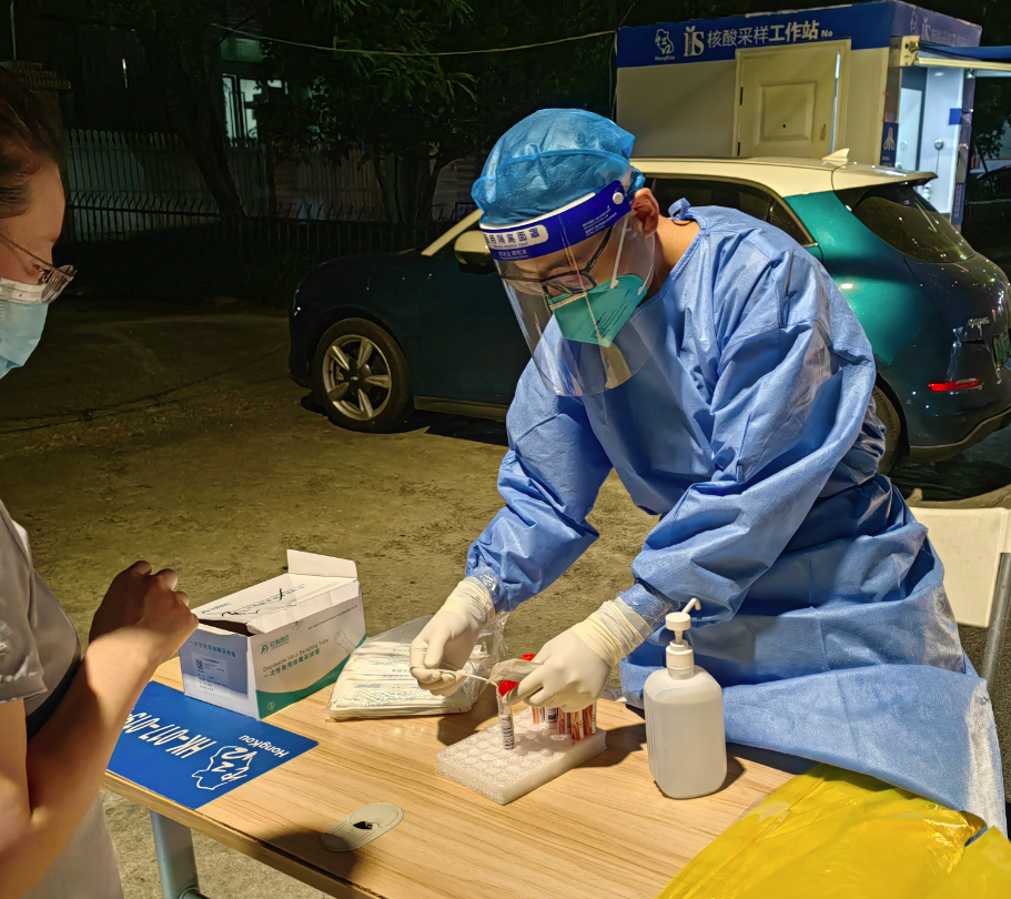 随着后来气温愈发高升,结合点位的实际情况,大家的穿着改为“二级防护”,但还是比较闷热的。温度超过35℃,感觉自己快要中暑了。尤其是像他那样戴着眼镜的采样员,工作时需要戴上面屏。起初工作那段时间,他的眼睛和面屏上布满雾气,几乎看不清居民喉咙的采样位置,只能凭借经验进行采样。