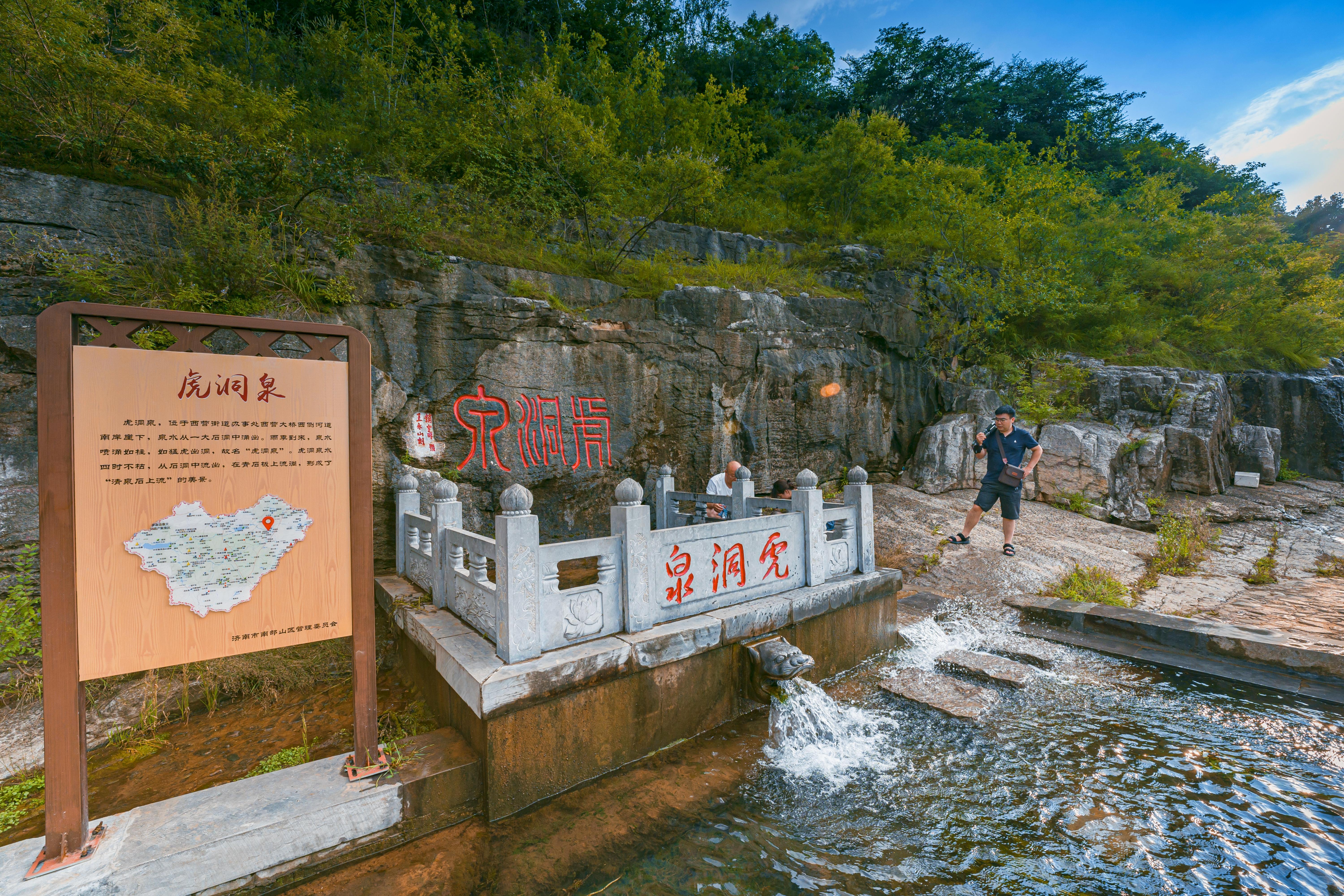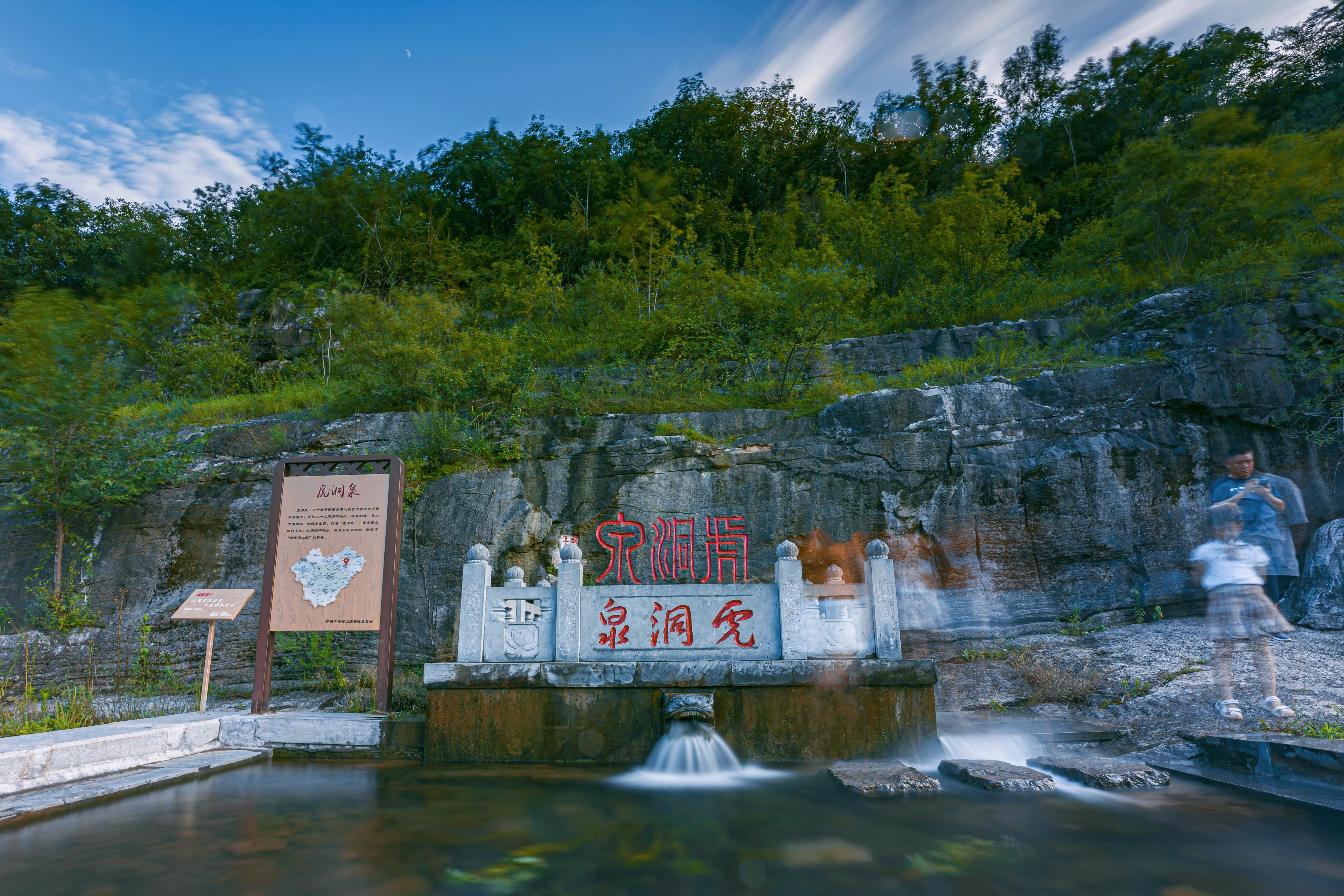 虎洞泉位于南山西营街道西营村南,锦绣川河南崖下,海拔294米。水从石缝中喷涌而出,水质优良,清冽甘甜。原来没有泉池,岩壁上刻有“虎洞泉”三字。