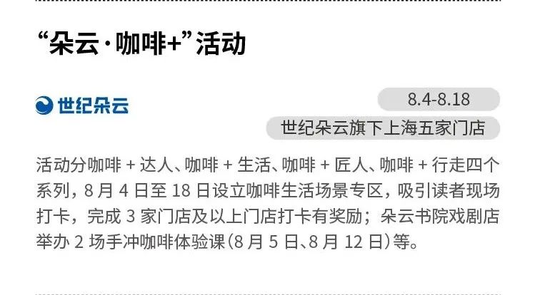 上海市书刊发行行业协会也将发布“2022年上海咖啡文化周·咖香书香在上海”20+新书单,联动全市75家品牌书店推出咖啡文化读物展陈,进行线上线下展销,推出上海咖啡广告图片展、咖香书香在上海等活动。参加“咖香书香在上海”咖啡文化读物展陈的浦东品牌书店共有13家,包括上海书城东方路店、朵云书院旗舰店、大隐湖畔书局、百新书局尚悦湾店、2家大众书局门店、7家西西弗书店门店。