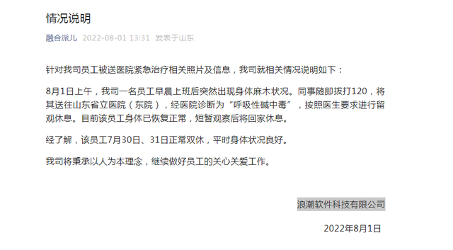 随即,下午1点31分,认证为浪潮科技员工之家的微信公众号“融合派儿”发布情况说明,针对我司员工被送医院紧急治疗相关照片及信息,表示公司一员工上班后出现身体麻木,经诊断为“呼吸性碱中毒”。具体全文如下: