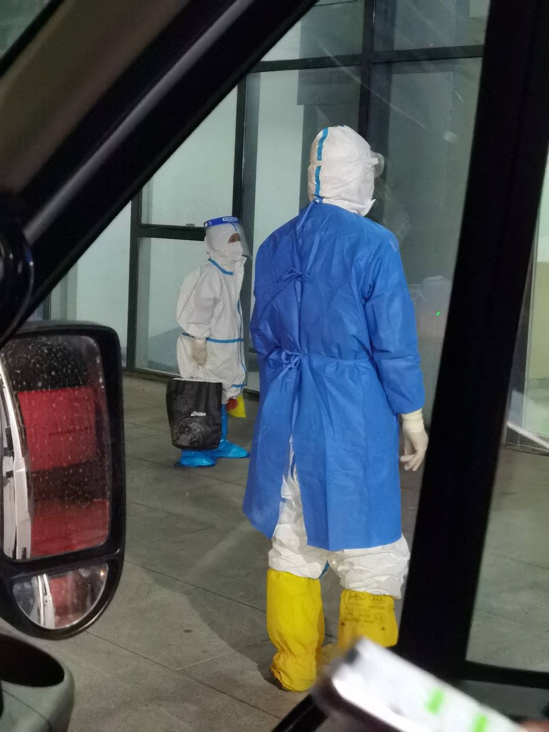 每趟接回来后,他们不会先脱防护服,因为穿脱防护服会耽搁时间,等车辆消毒后,他们会继续出发去下一个点,不下车的话,一天最多的时候接过七八趟。