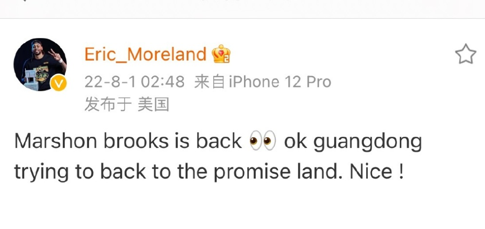 在这个时候,广东队的声音算是比较小的,只有一系列球员离开的传闻,比如王薪凯和汤杰等人被透露离队,却并没有什么引援的消息。昨天,突然有消息传出,称外援马尚-布鲁克斯将要复出,并且跟广东队完成续约。