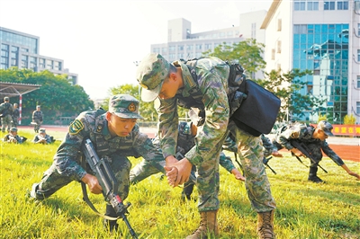 第七届全国学生军事训练营的学员们正在进行战术基础与防护训练。