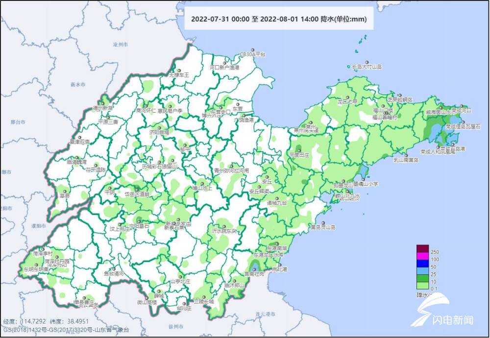 7月31日00时至8月1日14时山东降水量分布
