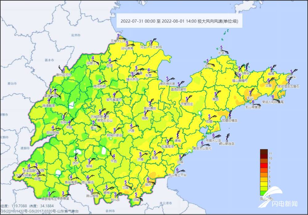 7月31日00时至8月1日14时山东阵风分布