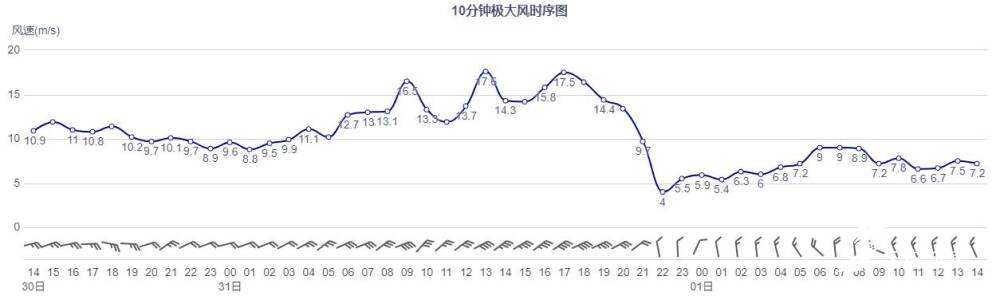 其中青岛市南大公岛阵风最大为8级(17.6米/秒),出现在31日13时。