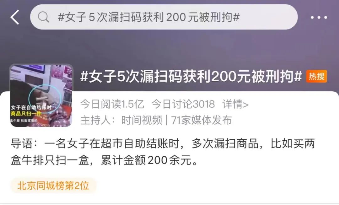 据@北京时间 消息,北京一名女子在超市自助结账时,5次漏扫商品,比如买两盒牛排只扫一盒,累计金额200余元。