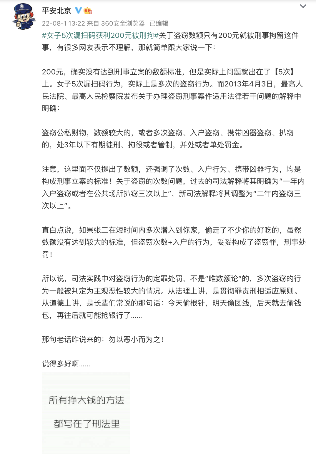 @平安北京 还表示,“从道德上讲,是长辈们常说的那句话:今天偷根针,明天偷团线,后天就去偷钱包,再往后就可能抢银行了……那句老话咋说来的:勿以恶小而为之!”