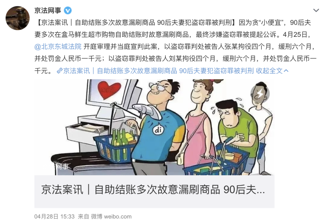 2022年4月,因贪“小便宜”,90后夫妻多次在盒马鲜生超市购物自助结账时故意漏刷商品,最终涉嫌盗窃罪被提起公诉。