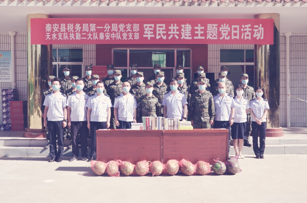 秦安县税务局第一分局党支部同天水支队执勤二大队秦安中队党支部开展“军民共建主题党日活动”,为驻秦部队送去书籍和水果,共话军民鱼水情。(杨靖靖)