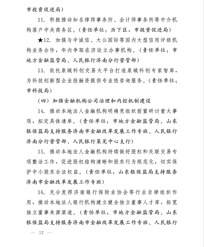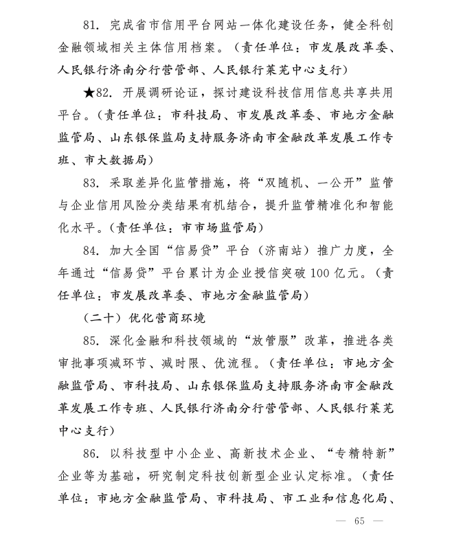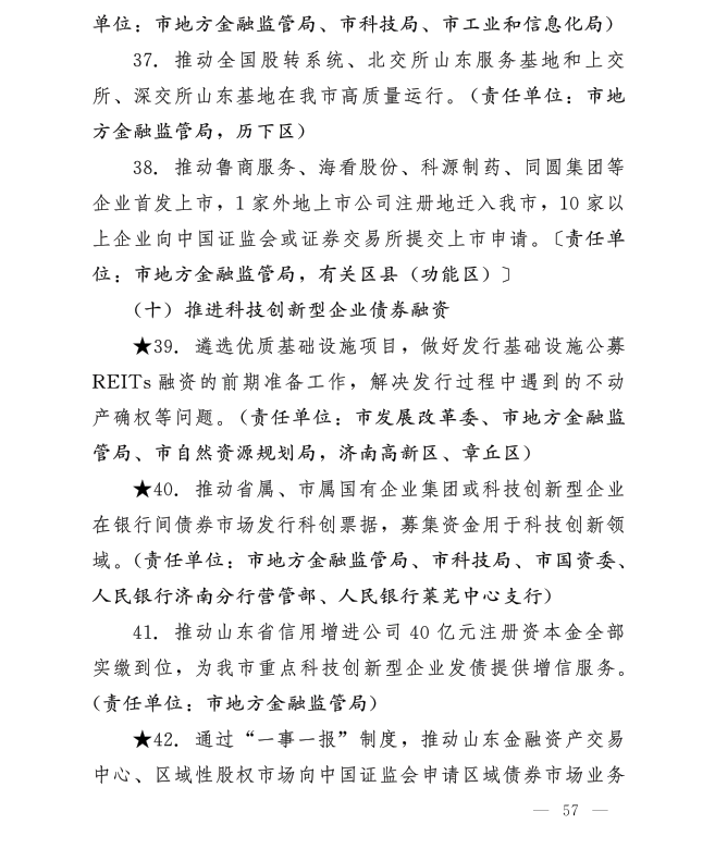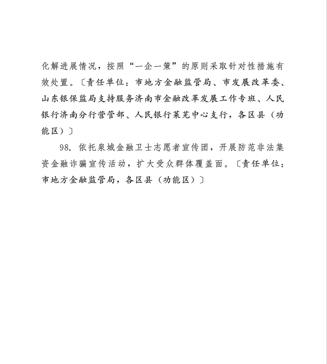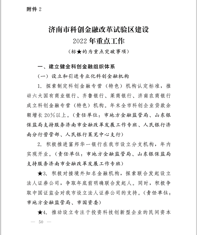 此外,按照“项目化运作、清单化管理”的工作推进思路,围绕各项任务落实,《实施方案》最后提出112个重点项目,逐一明确责任单位、完成时限和完成标准,形成了《济南市建设科创金融改革试验区重点项目表》,确保目标有支撑、措施能落实、效果可评估。《实施方案》还明确了本年度重点开展的98项工作,其中包括20项重点突破事项,形成了《济南市科创金融改革试验区建设2022年重点工作》(见下图),目前各项工作均已全面启动,并取得了阶段性进展,力争年底前形成一批创新成果,实现试验区建设第一年全面起势。