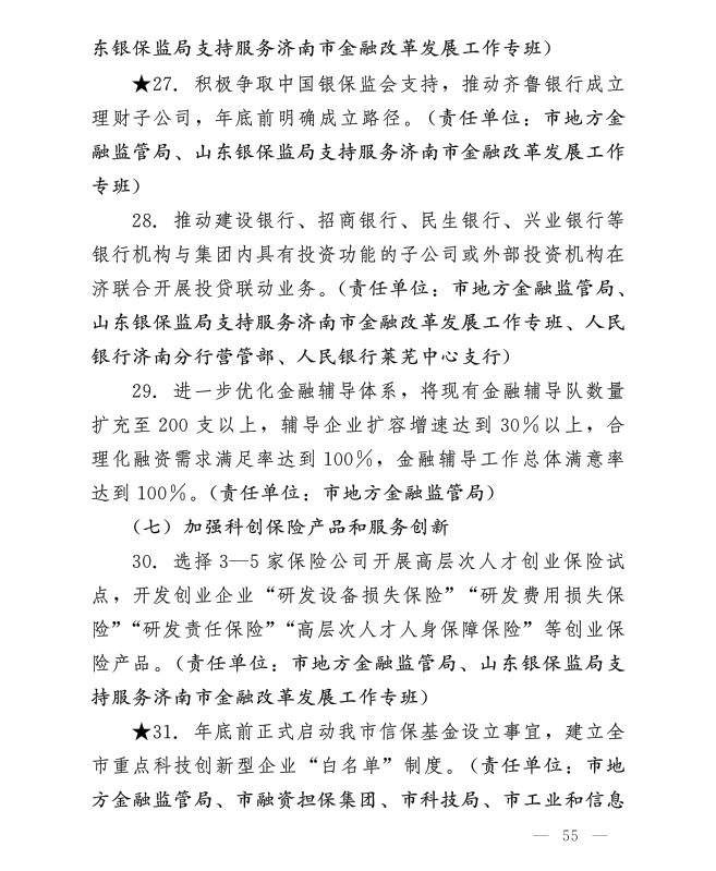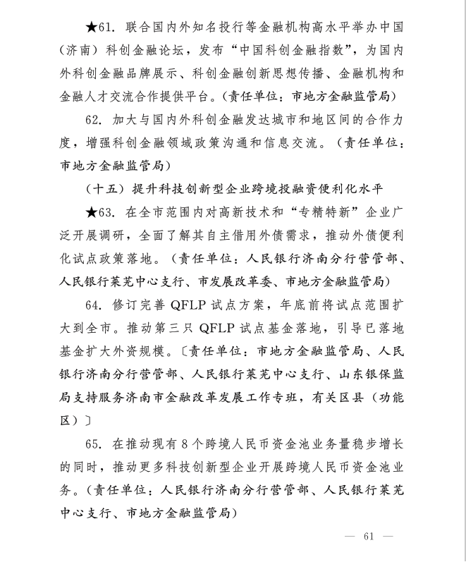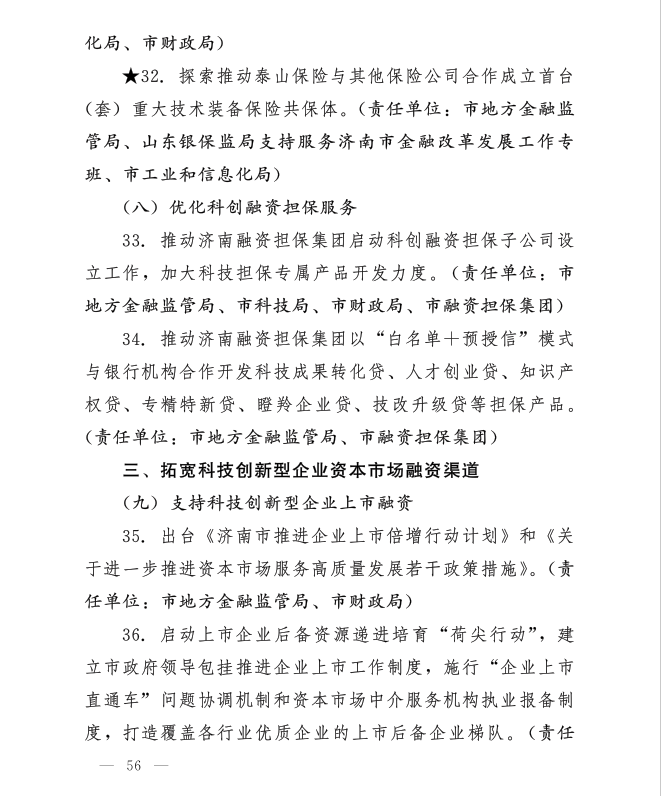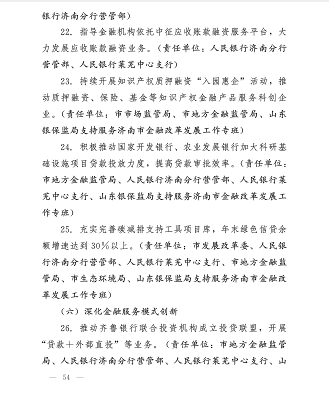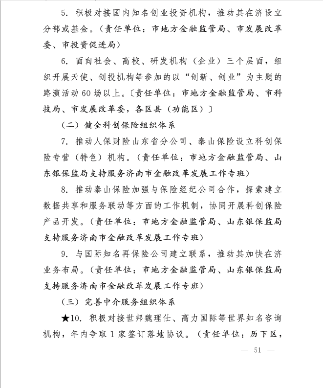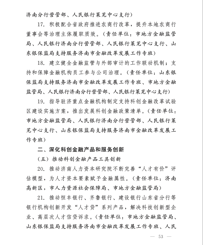 《实施方案》在保障措施中提到,加强组织领导。成立济南市委、市政府主要领导同志任双组长的市科创金融改革试验区领导小组,从市直相关部门及驻济金融机构抽调业务骨干组建试验区实体化工作专班。强化产业支撑。加快建设实体经济、科技创新、现代金融、人力资源协同发展的产业体系。深化科技创新体制改革。改进科技创新评价机制和考核体系,推动科研院所去行政化。完善智库咨询服务。成立“科创金融改革试验区建设专家咨询委员会”,与国内知名高校合作成立金融研究机构。营造良好舆论氛围。高水平举办科创金融论坛,发布“中国科创金融指数”,打造全国科创金融改革发展“风向标”城市。