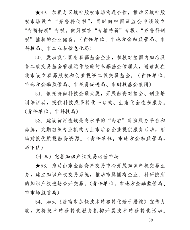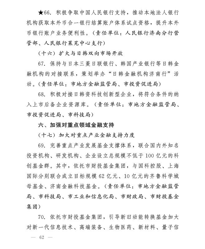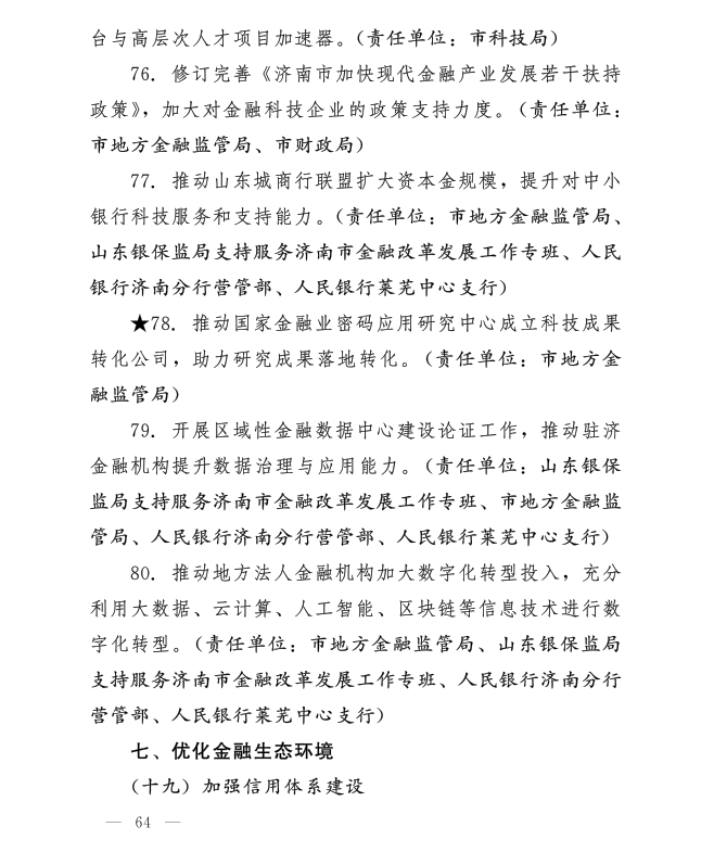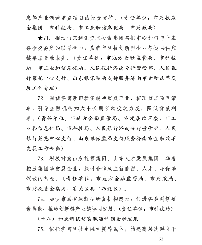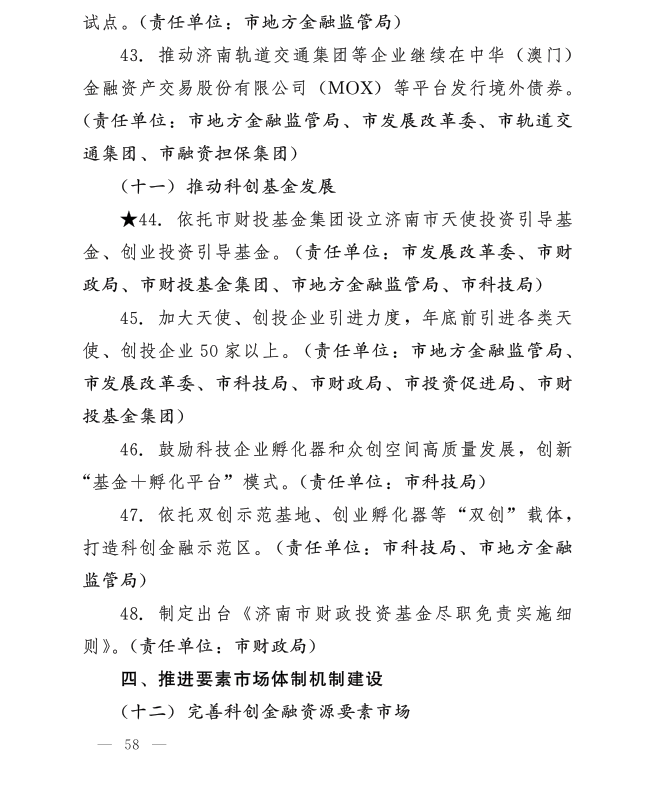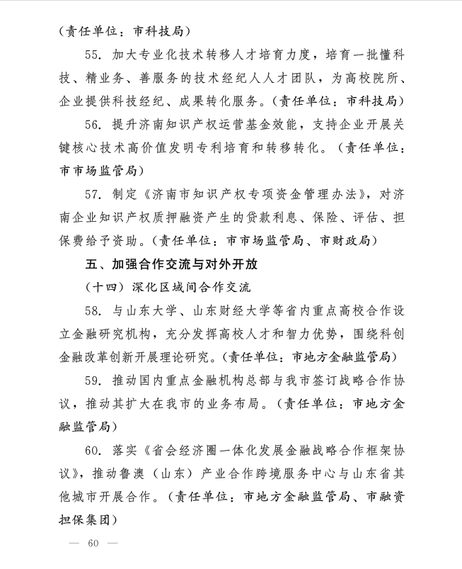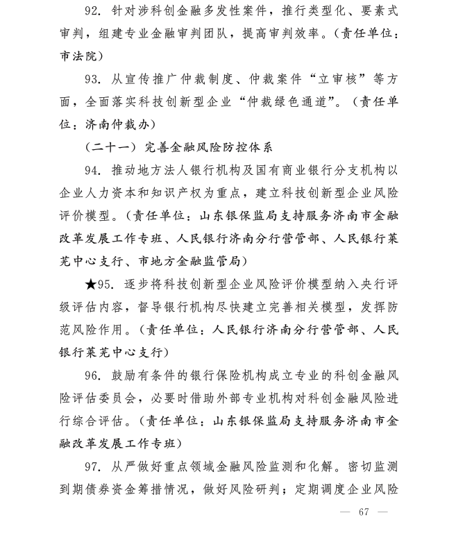《实施方案》在保障措施中提到,加强组织领导。成立济南市委、市政府主要领导同志任双组长的市科创金融改革试验区领导小组,从市直相关部门及驻济金融机构抽调业务骨干组建试验区实体化工作专班。强化产业支撑。加快建设实体经济、科技创新、现代金融、人力资源协同发展的产业体系。深化科技创新体制改革。改进科技创新评价机制和考核体系,推动科研院所去行政化。完善智库咨询服务。成立“科创金融改革试验区建设专家咨询委员会”,与国内知名高校合作成立金融研究机构。营造良好舆论氛围。高水平举办科创金融论坛,发布“中国科创金融指数”,打造全国科创金融改革发展“风向标”城市。