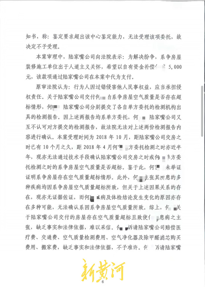 对此,开发商上海陆家嘴(集团)有限公司(以下简称“陆家嘴集团”)认为,何先生的身体状况及证据材料无法判断系甲醛中毒,公司也对房屋进行了空气检测,并不存在甲醛等有害气体超标情形,且何先生在房屋维修期间居住,即使因此患病也是由其自身过错导致。出于人道主义关怀,陆家嘴集团替装修单位代付5000元的补偿金。