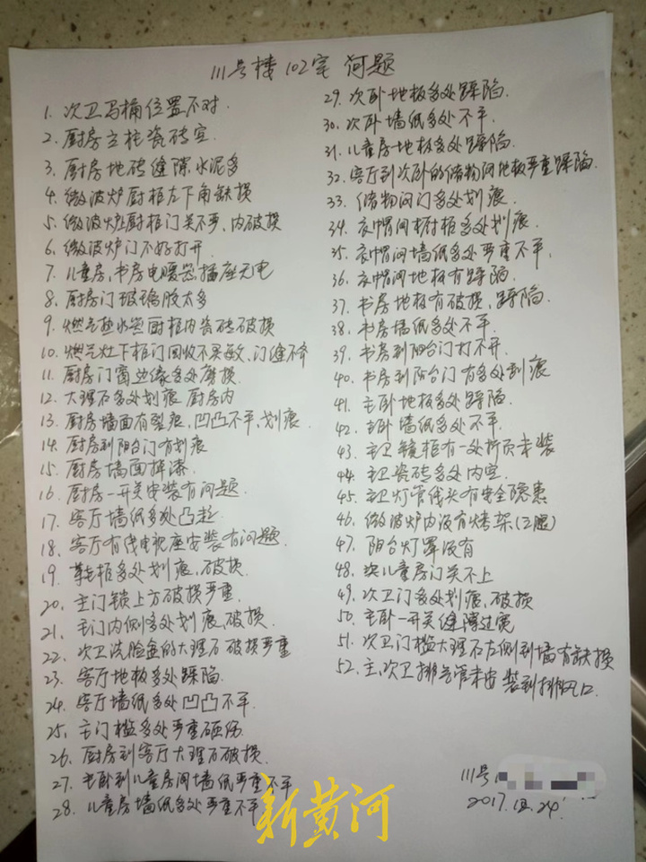 2017年12月底,何先生和妻子终于盼来了正式交房,2018年1月初搬进了新房。何先生和妻子刚搬进新房时,整体感觉良好,但仔细一检查却发现了诸多问题。“马桶几乎贴墙安装,右侧空隙只留了8厘米,连蹲都蹲不下;多处大理石破损开裂、墙面掉漆、墙纸翘起、地板有声响、墙面瓷砖多处空鼓、洗衣机房无插座、儿童房插座无通电等等。”何先生经过仔细检查,一共发现了52项装修缺陷,用A4纸记录了下来,并一一进行了拍照存档。