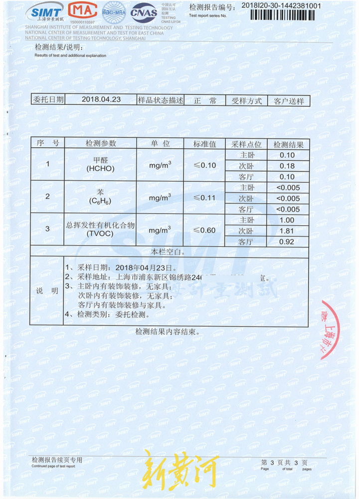 “之前我多次参加体检,都没有诊断出这些疾病。我怀疑屋内装修材料不够环保,把情况反映给了开发商,一位负责人称如果觉得有问题,可以让我自己先检测。”2018年4月28日,何先生花费2760元,在装修公司负责人在场的情况下,委托专业环评机构上海市计量测试技术研究院对房屋空气质量进行了检测。根据检测报告显示:依据GB/T18883-2002《室内空气质量标准》认定,房屋甲醛(单位标准值为≤0.10mg/m³)检测值分别为主卧0.10mg/m³,次卧0.18mg/m³,客厅0.10mg/m³;总挥发性有机化合物(TVOC)(单位标准值为≤0.60mg/m³)检测值分别为主卧1.00mg/m³,次卧1.81mg/m³,客厅0.92mg/m³。经检测,次卧甲醛超标,主卧、次卧、客厅TVOC超标。