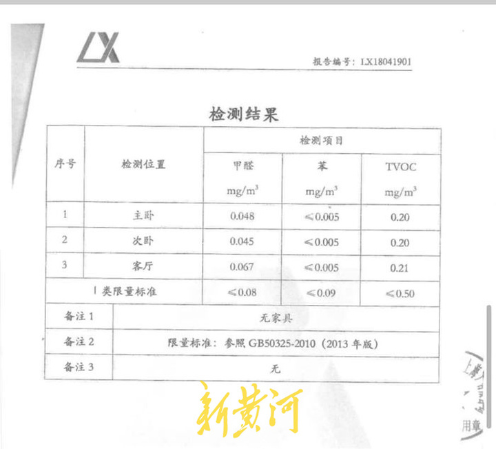 不过,对于这份检测报告,陆家嘴集团并不认可。陆家嘴集团回应称,何先生在进行单方面检测时,将房屋关闭多日,并不符合检测条件,对此装修公司人员已当场提出异议。经陆家嘴公司委托,蓝莘环境监测技术(上海)有限公司于2018年4月25日也出具了一份房屋的室内空气检测报告。检测报告依据GB50325-2010(2013版)《民用建筑工程室内环境污染控制规范》、GB/T18204.2-2014《公共场所卫生检验方法第2部分:化学污染物》,认定:房屋甲醛(单位标准值为≤0.08mg/m³)检测值分别为主卧0.048mg/m³,次卧0.045mg/m³,客厅0.067mg/m³;总挥发性有机化合物(TVOC)(单位标准值为≤0.50mg/m³)检测值分别为主卧0.20mg/m³,次卧0.20mg/m³,客厅0.21mg/m³。检测报告委托方为“袁工”,检测日期为2018年4月20日—25日。经检测,所有数值均符合标准。
