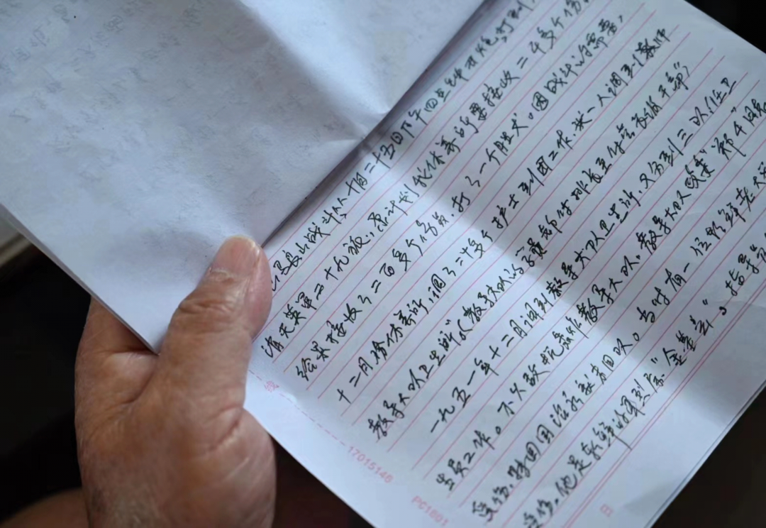 牟济生老人根据回忆写出的手稿,他希望通书写手稿的方式,既能让自己回忆起往事,又能给后人讲清楚今天的幸福生活多么地来之不易。