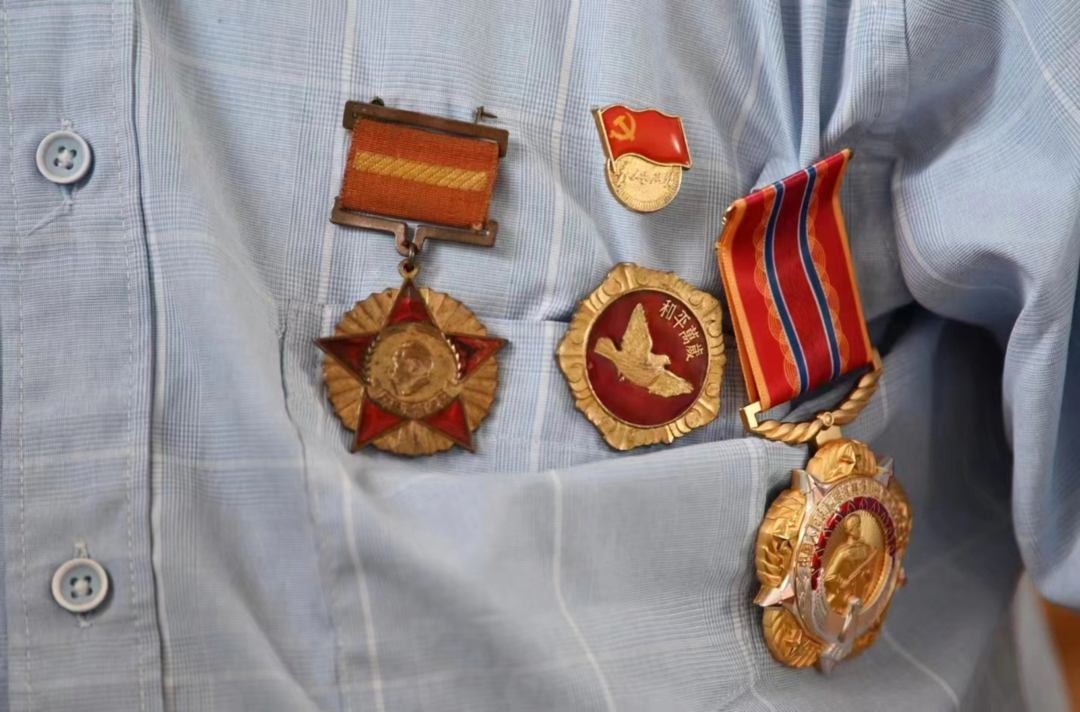 挂在牟济生老人胸前的三枚纪念勋章,从左到右分别是:“抗美援朝”纪念章(1951年颁发)、“和平万岁”纪念章(1953年颁发)、纪念抗美援朝70周年纪念勋章(2020年颁发)。