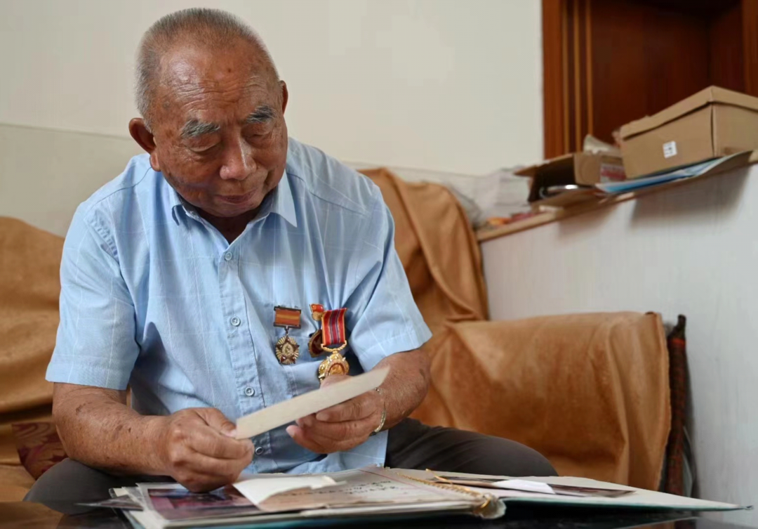 2022年8月1日,中国人民解放军建军95周年纪念日,牟济生老人在家中翻看当年的旧照片。