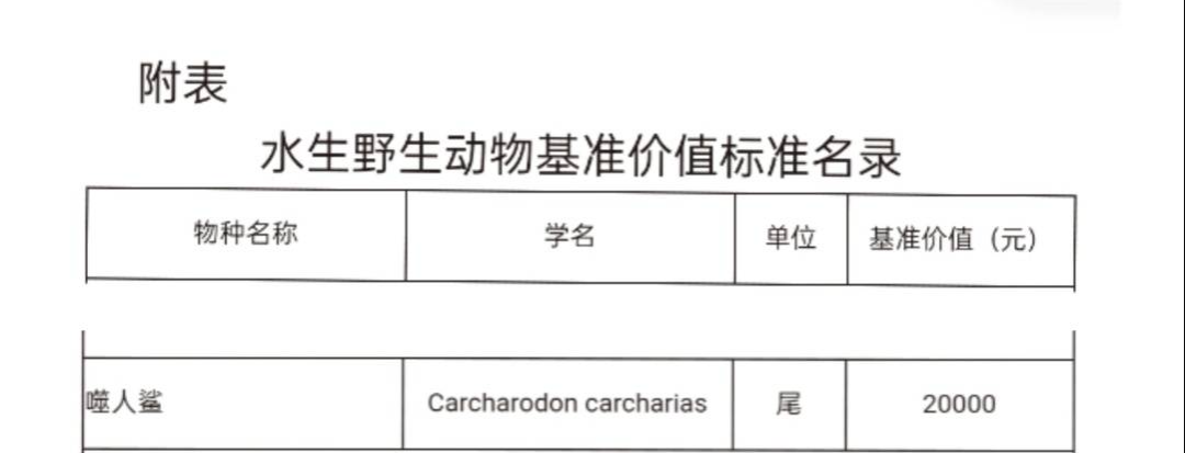 负责人解释,根据农业农村部令〔2019〕5号:《水生野生动物及其制品价值评估办法》,噬人鲨基准价值为20000元,“鲨鱼的大小等因素,都涉及最终的案件结果。”