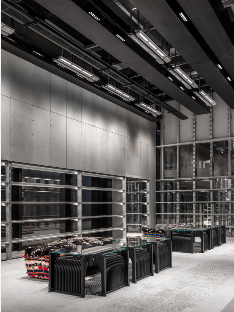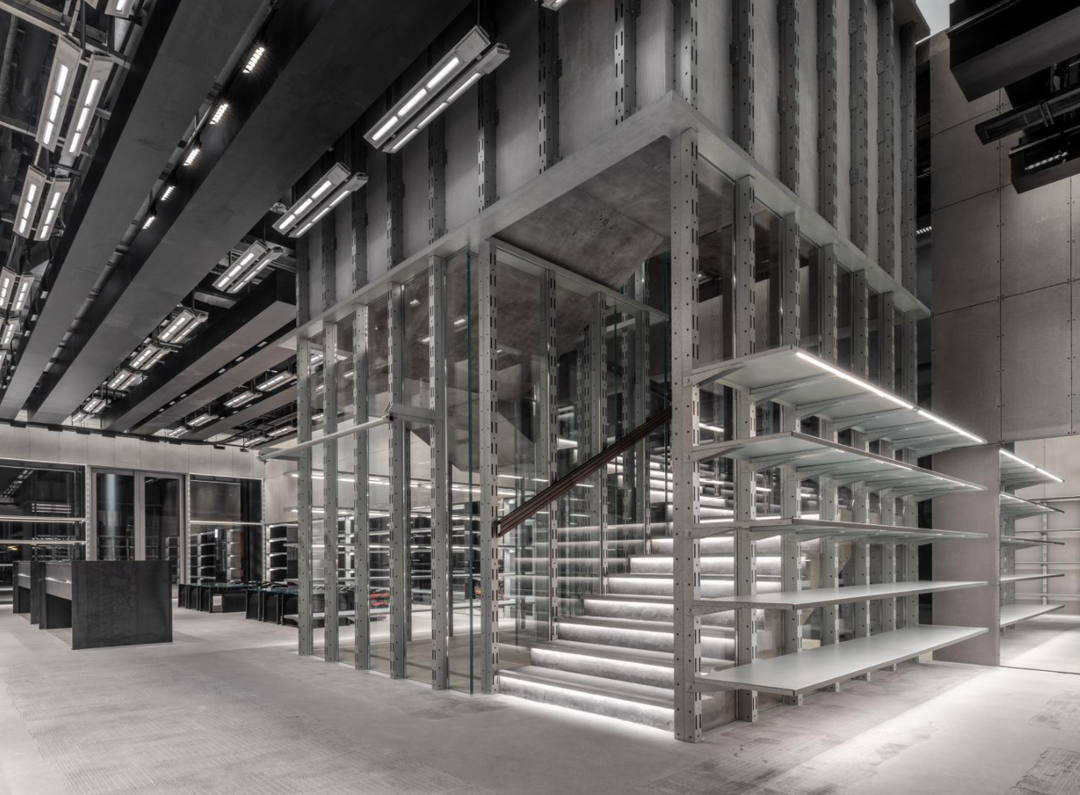 全新空间共计552平方米,店中央的楼梯将整栋建筑分为上下两层,楼梯上有多段转折平台,内部是钢架结构,外部为玻璃镶板。旗舰店的外立面由两层组成:外层是落地悬挂式的全玻璃幕墙系统,里层是带有产品展示橱窗的特制水泥板钢架。店内装潢刻意呈现一种“未完成”的状态,地面和墙面铺有特殊肌理的镶板,呈现磨损、带有污渍或碎裂的效果;重型铝制陈列架的表面具有斑驳而粗糙的质感;人造皮革座椅被设计的破损且变形。