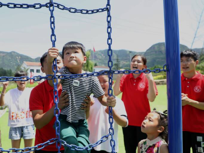 8月1日,在沂南县依汶镇青杨行村,大学生志愿者们陪伴孩子们开展攀爬拓展运动。