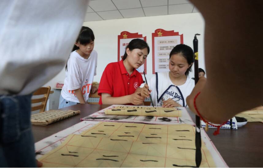 8月1日,在沂南县依汶镇青杨行村,大学生志愿者在教孩子们学习书法。