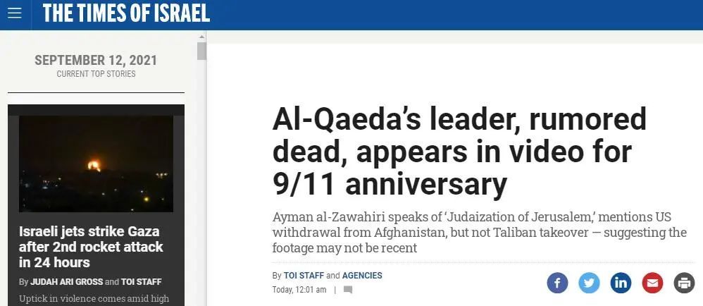 据环球网2021年9月12日援引《以色列时报》、《今日印度》等多家外媒的报道,在“9·11”事件20周年当天,“基地”组织的媒体As-Sahab发布了一段长达60分钟的视频,视频中的发言者是此前被传已经去世的“基地”组织头目扎瓦希里。