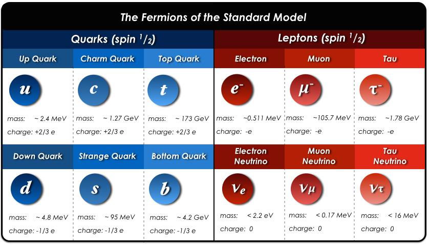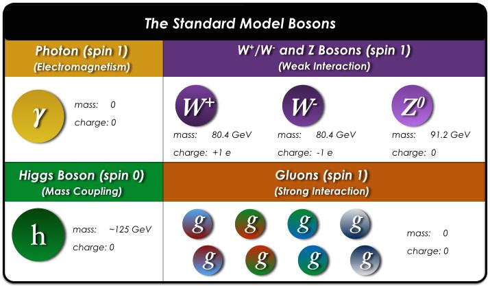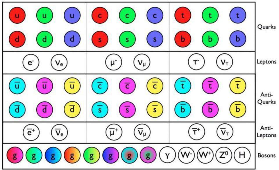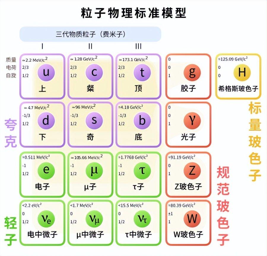 标准模型中的粒子。紫色部分为夸克,夸克有6种味,每种味有3种色,每种夸克都有反夸克,总计36种夸克。绿色部分为轻子,轻子有6种味,没有色,有反粒子,总计12种轻子。图中夸克和轻子排成3列,每一列构成物质的一代。夸克和轻子右边一列是规范玻色子,其中胶子有8种色,没有反粒子,光子和Z玻色子各只有一种,W玻色子有反粒子,总计2种。最右边粒子是希格斯玻色子,只有1种。标准模型总计61种基本粒子
