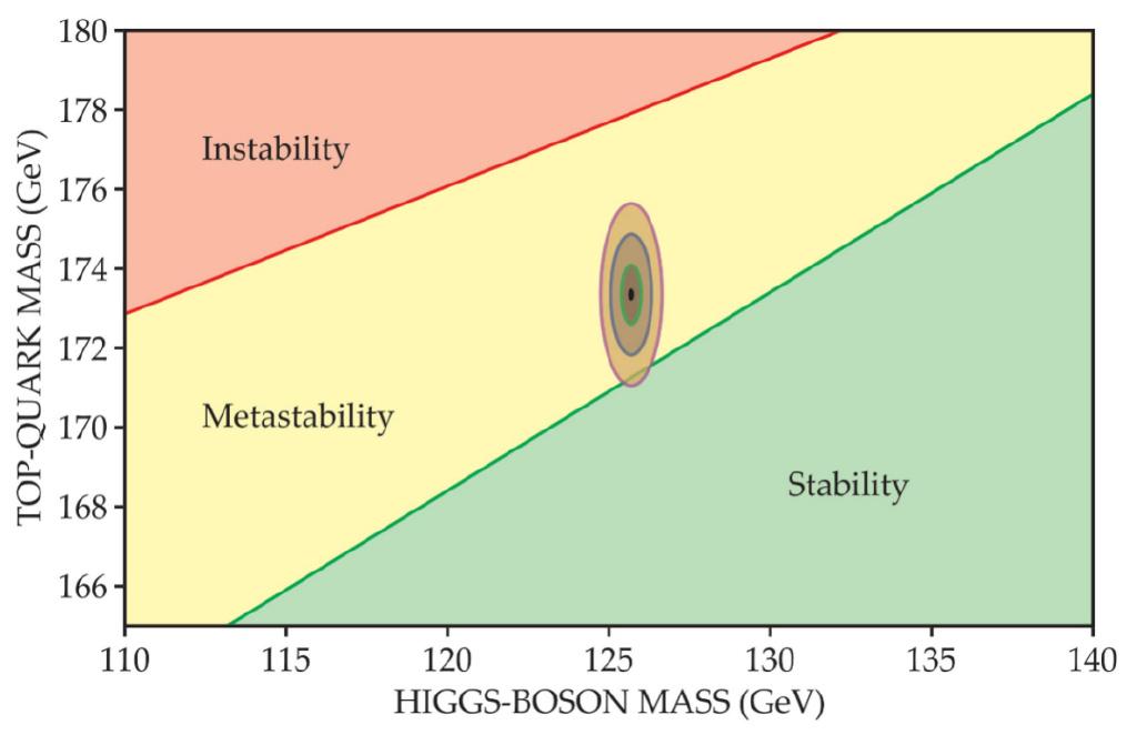 根据标准模型,由希格斯粒子和顶夸克的质量,可以确定出希格斯势的一级近似结果。从目前的结果看,几十亿年前,宇宙进入了希格斯势一个局域极小值点,而非全局极小值点,意思是宇宙是亚稳态的;未来宇宙会进入另一更小的极小值点,即发生相变,基本粒子质量随之而变,我们现在所熟悉的宇宙会面目全非。