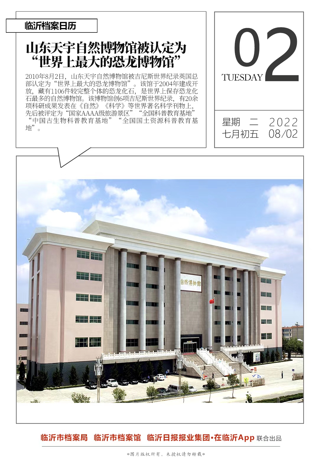 临沂档案日历丨8月2日:山东天宇自然博物馆被认定为“世界上最大的恐龙博物馆”