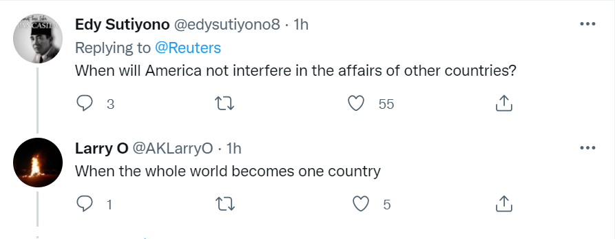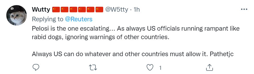 佩洛西才是升级事态的人……美国官员一如既往地像疯狗一样猖狂,不理会其他国家的警告。美国总是为所欲为,而其他国家必须允许它。悲哀