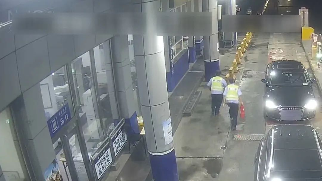 站内值守的民警们在视频监控中发现了这一突发情况,同时注意到现场有部分群众滞留,且后方持续有车流驶过,形势非常危急。