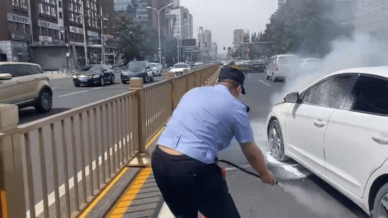 今年6月的一个周末,朝阳分局八里庄派出所民警张杰在辖区巡逻时,发现一辆白色轿车停在路上,前引擎盖处冒出阵阵浓烟,疑似发生了自燃。