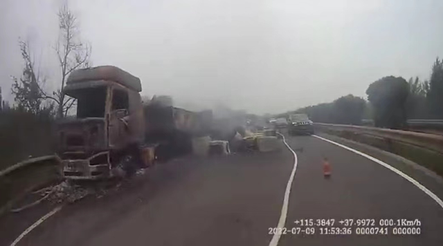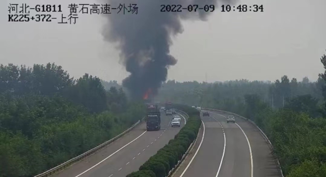 高速监控视频显示,当天上午10点48分,停靠在道路一侧最外车道的一辆半挂大货车起火,冒出的浓浓黑烟直冲云霄,并且火势不断增大,车上有燃烧的物体不断滚落下来,像一个个火球。车上物体滚落到地上后继续燃烧,浓厚的黑烟笼罩在上方天空,由于火势太大一度导致该侧车道交通中断。随后,多辆消防车赶到,消防员展开救援,约十分钟后火势得到控制。交警对现场进行勘察,询问驾驶员得知,大货车左后轮爆胎后起火,导致车辆自燃,该货车所运送的400台洗衣机全部烧毁,大货车也损毁严重,初步预估损失数十万。万幸没有人员伤亡。