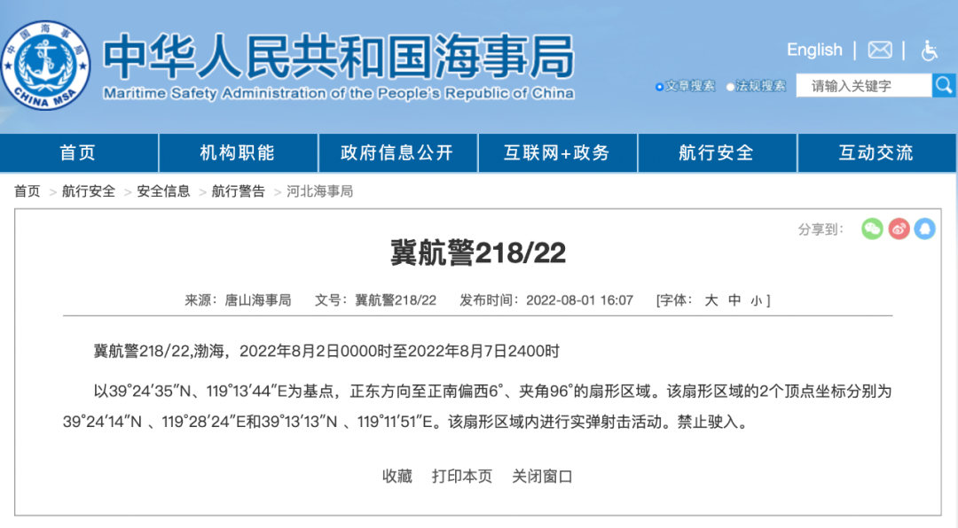 据唐山海事局消息,冀航警218/22,渤海,2022年8月2日0000时至2022年8月7日2400时。以39°24′35″N、119°13′44″E为基点,正东方向至正南偏西6°、夹角96°的扇形区域。该扇形区域的2个顶点坐标分别为39°24′14″N、119°28′24″E和39°13′13″N、119°11′51″E。该扇形区域内进行实弹射击活动。禁止驶入。