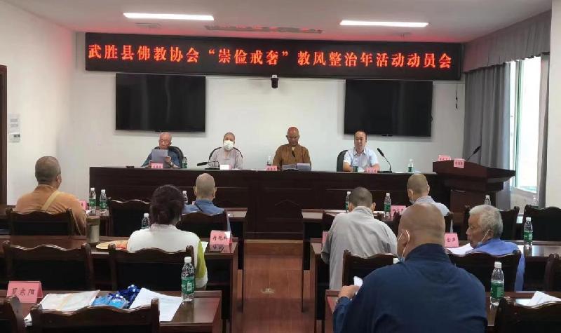 2022年7月29日下午,武胜县佛教协会召开“崇俭戒奢”教风整治年活动动员会。县佛协领导班子成员,全县佛教活动场所负责人、佛教教职人员参加会议。