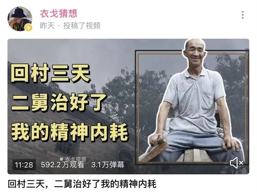 最近,由B站up主“衣戈猜想”发布的一则叫《回村三天,二舅治好了我的精神内耗》的视频,在朋友圈刷屏了,热度一直维持到今天,还在持续攀升。