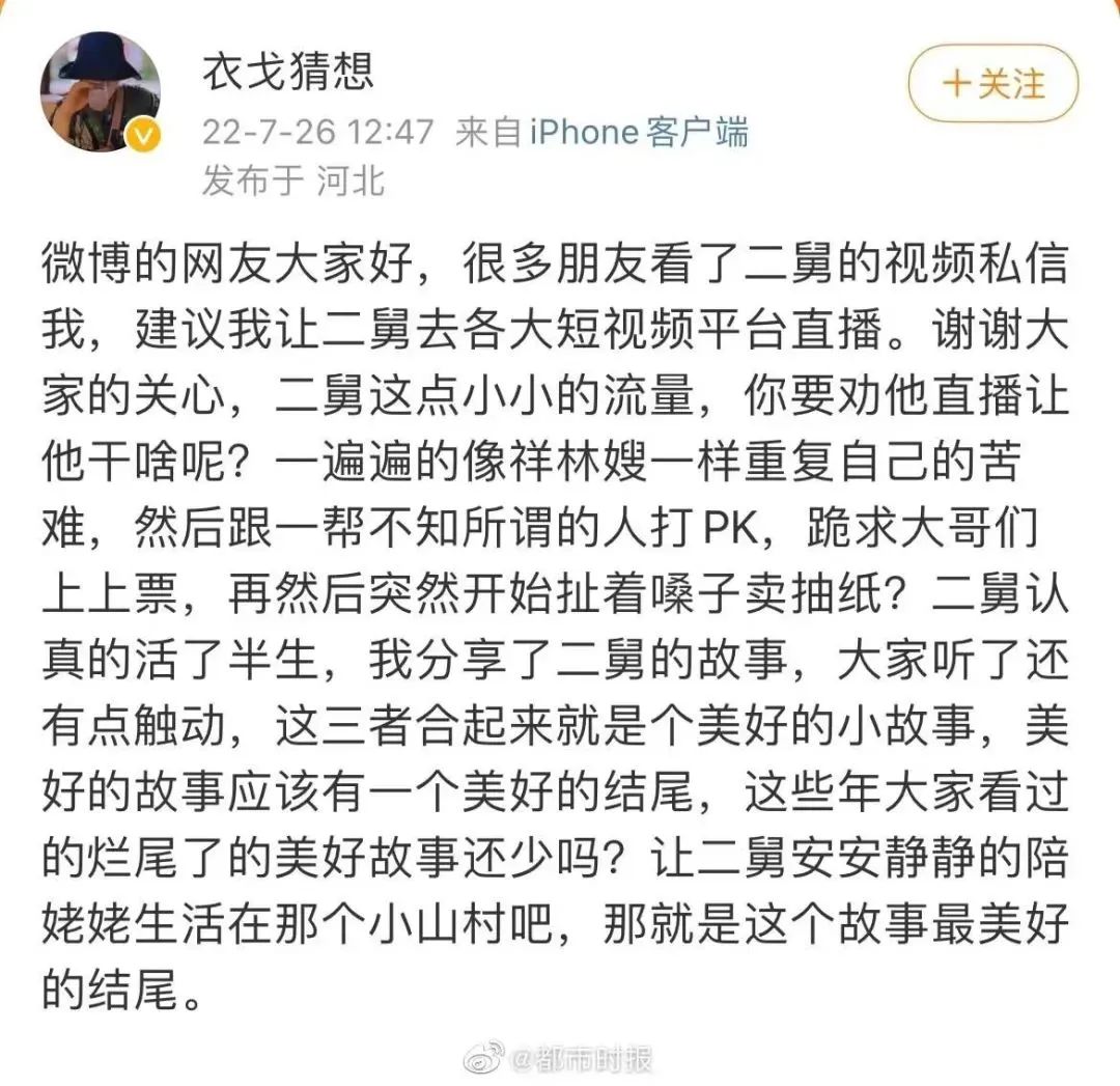在二舅的视频爆火刷屏以后,有网友建议让作者给二舅开直播,作者做出了如下的回复: