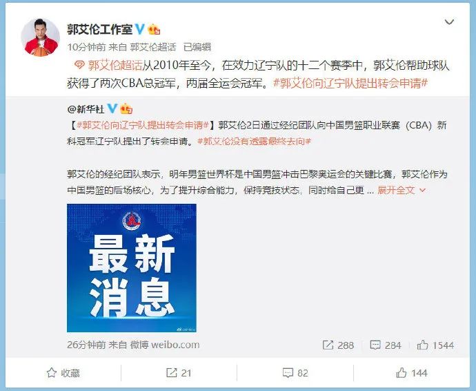 郭艾伦的经纪团队表示,明年男篮世界杯是中国男篮冲击巴黎奥运会的关键比赛,郭艾伦作为中国男篮的后场核心,为了提升综合能力,保持竞技状态,同时给自己更大的挑战,选择主动跳出舒适圈,有了转会的意向。